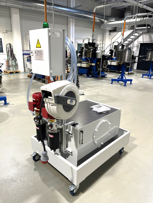 Mit unserer neuen mobilen Ölfilteranlage können wir nun flexibel das Schneidöl unserer Bearbeitungsmaschinen auffüllen und im gleichen Zuge das Öl im ym-Bereich filtern, wodurch wir das Öl länger wiederverwenden können. Das schont die Kühlmittel-Pumpen der Maschinen und die Umwelt. |